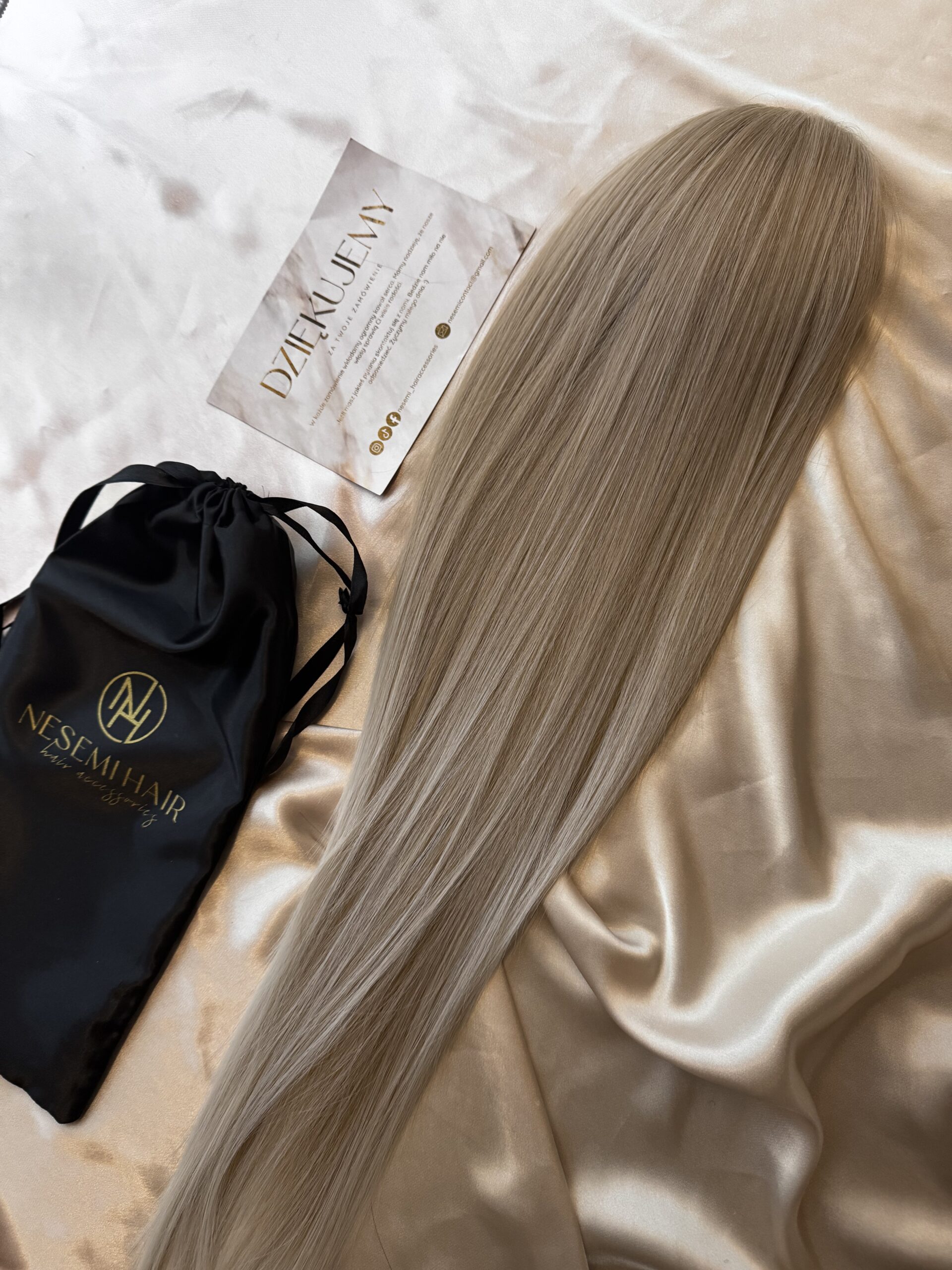 Aby włosy się nie plątały należy je przechowywać w siatce i woreczku satynowym dołączonym do zestawu.