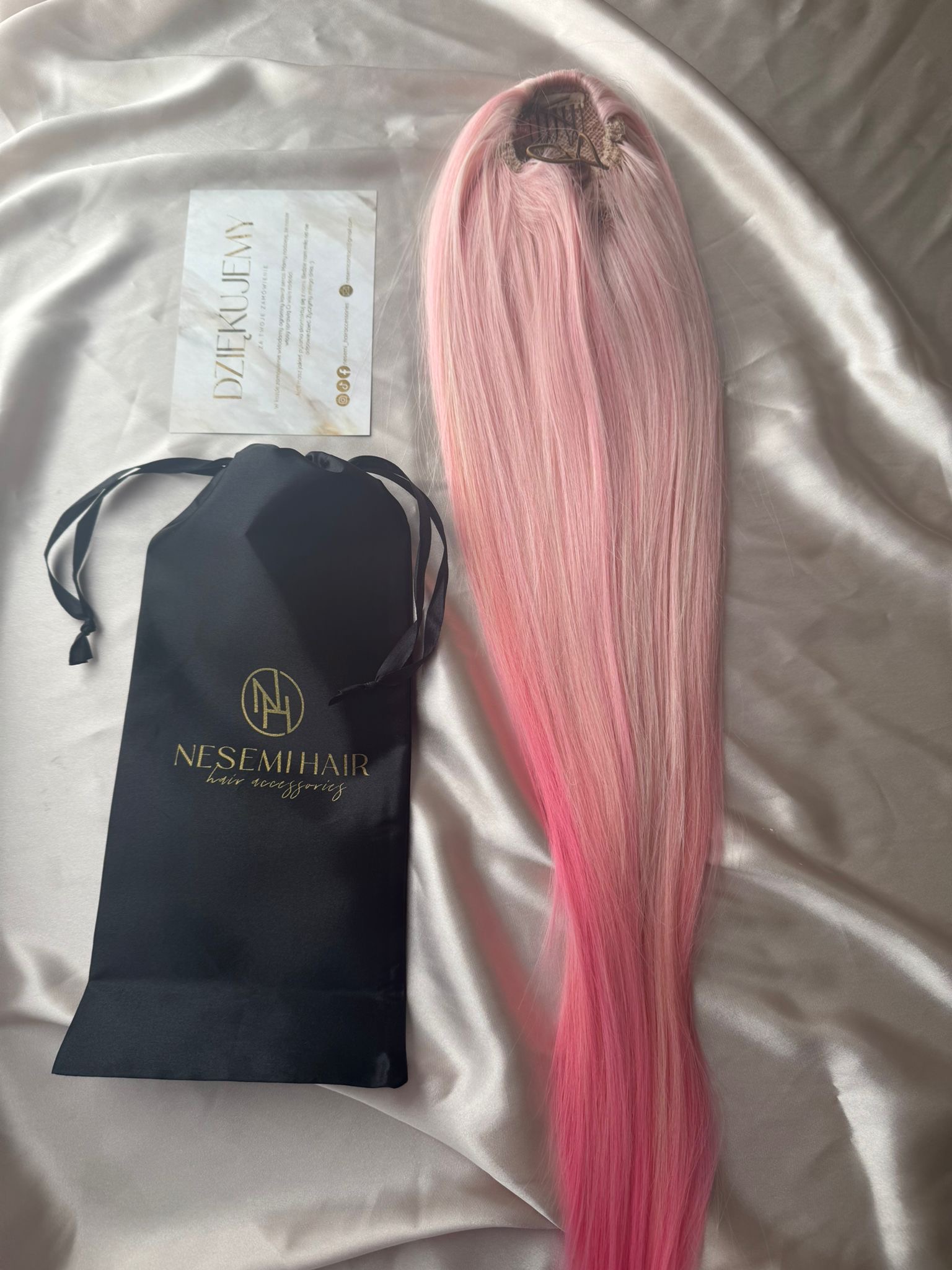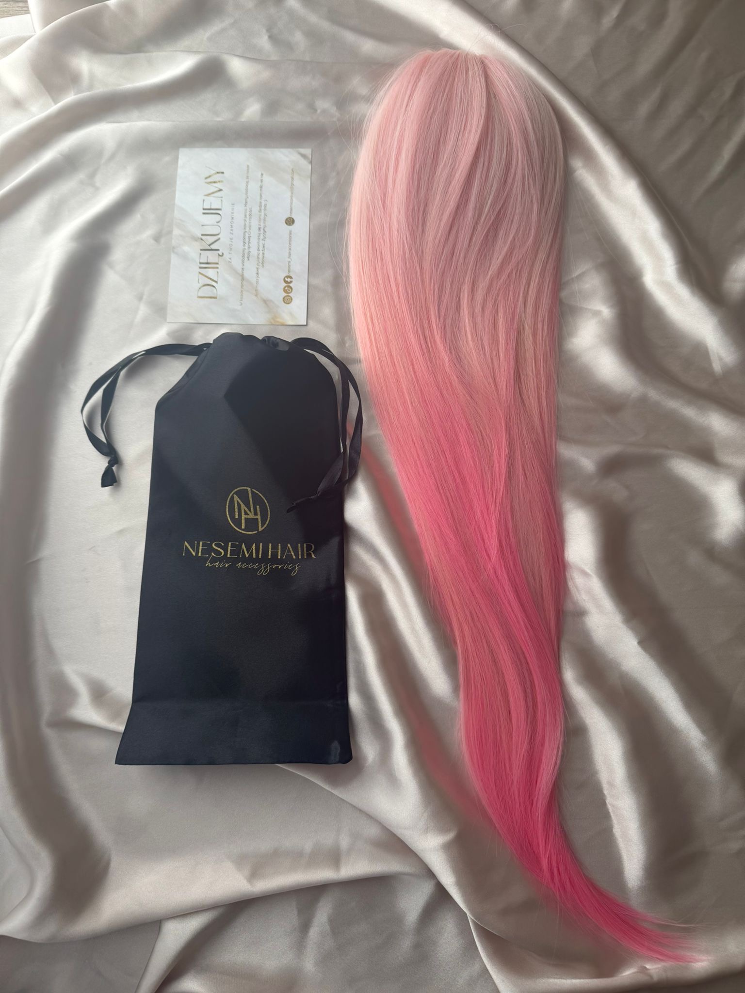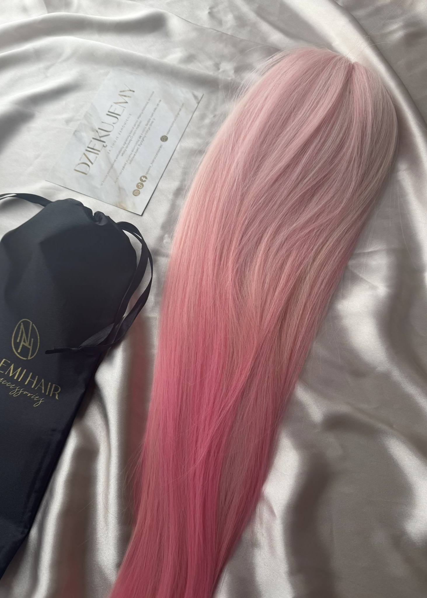 Aby włosy się nie plątały należy je przechowywać w siatce i woreczku satynowym dołączonym do zestawu.