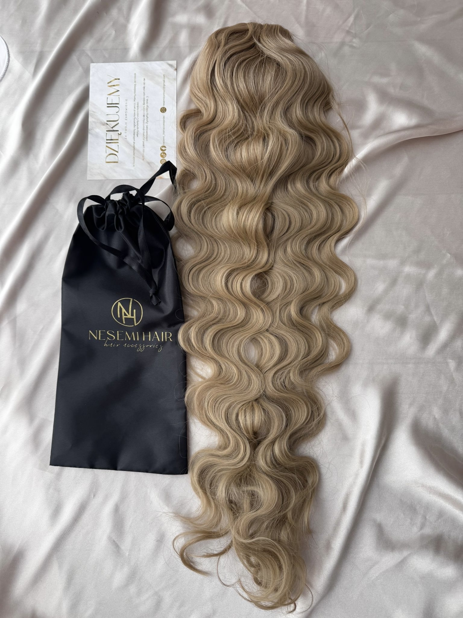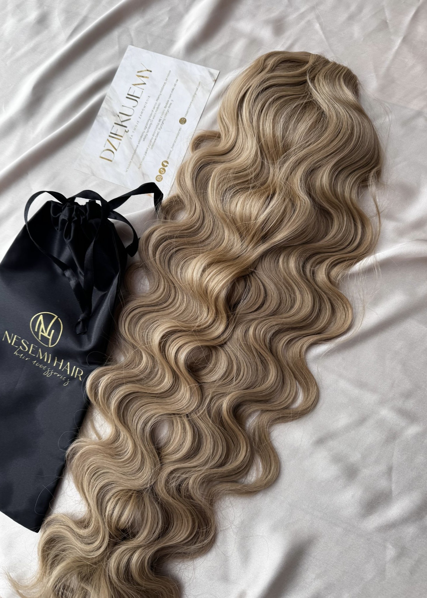 Aby włosy się nie plątały należy je przechowywać w siatce i woreczku satynowym dołączonym do zestawu.
