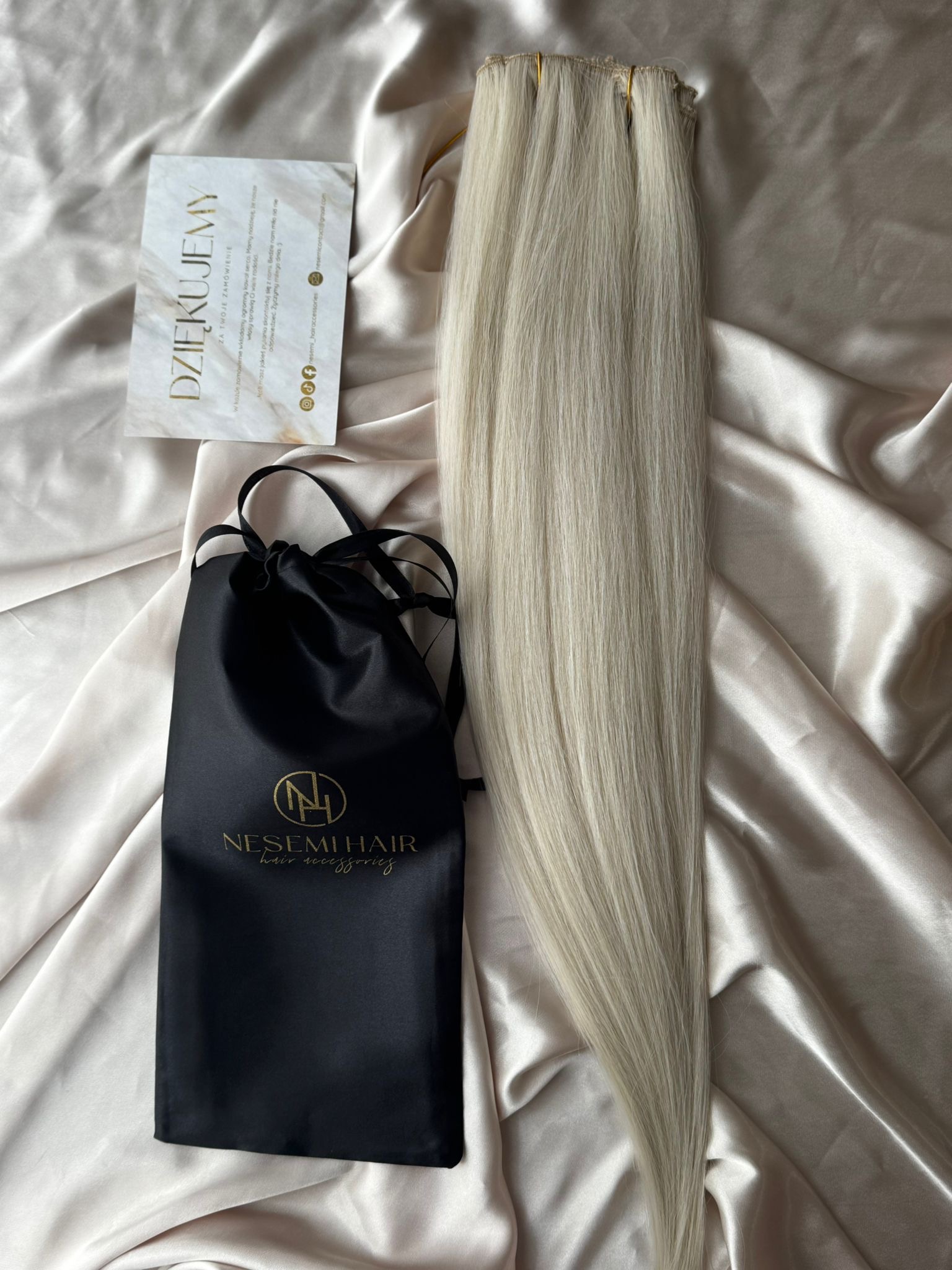 Aby włosy się nie plątały należy je przechowywać w siatce i woreczku satynowym dołączonym do zestawu.